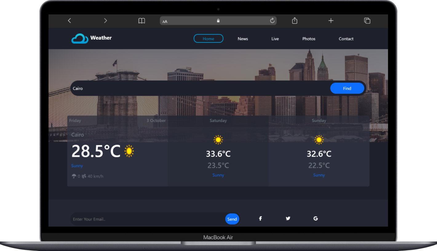 Html BootStarb CSS JavaScript JSON APIA simple Weather Website project built with HTML, CSS, and JavaScript, using an external API to fetch and display Weather Statue interactively. The site provides a clean interface for browsing and searching easily.